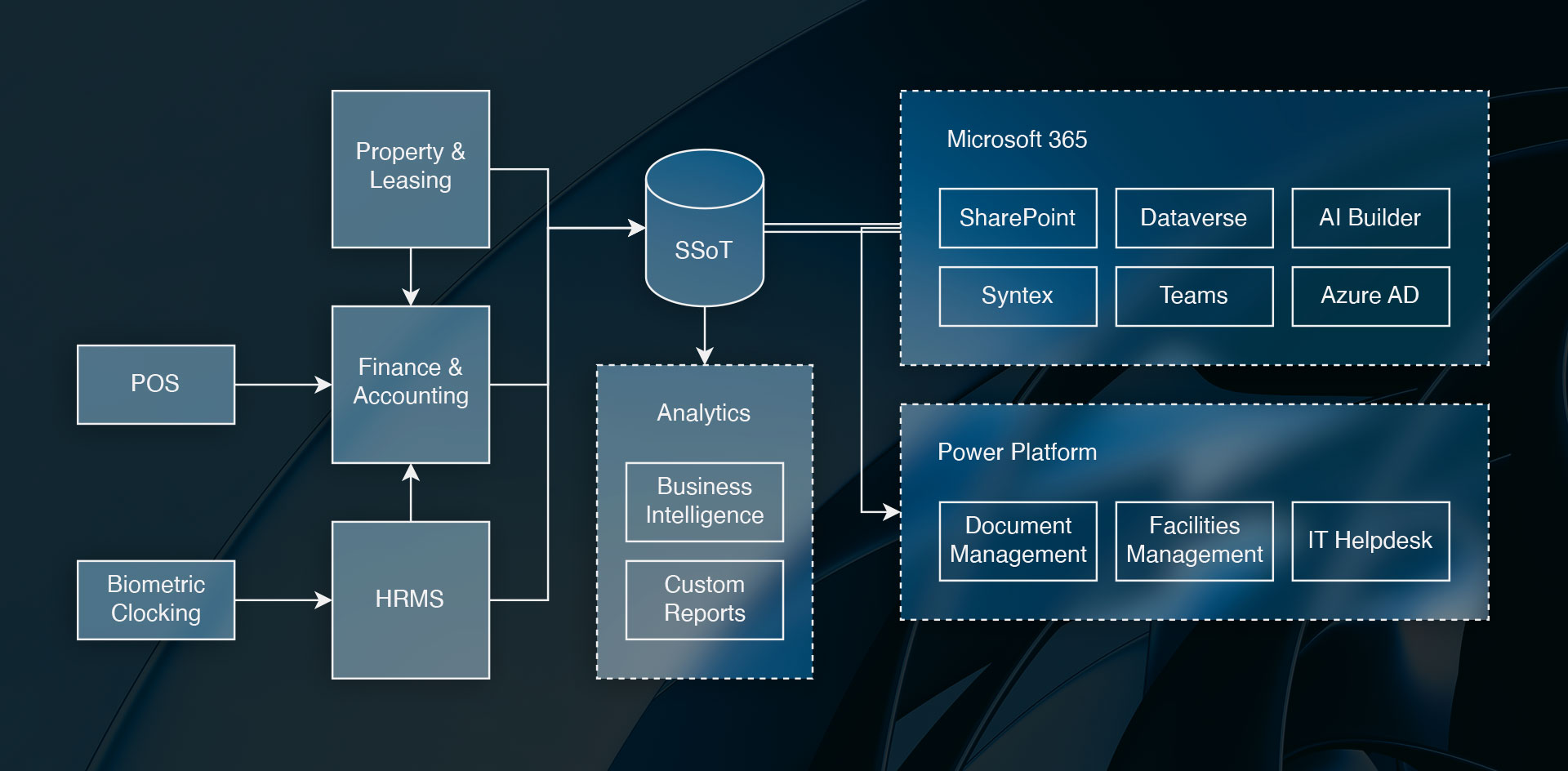 - Data Centralisation: The SSoT solution collected data from various sources including outlet POS systems, property management software, and finance tools.